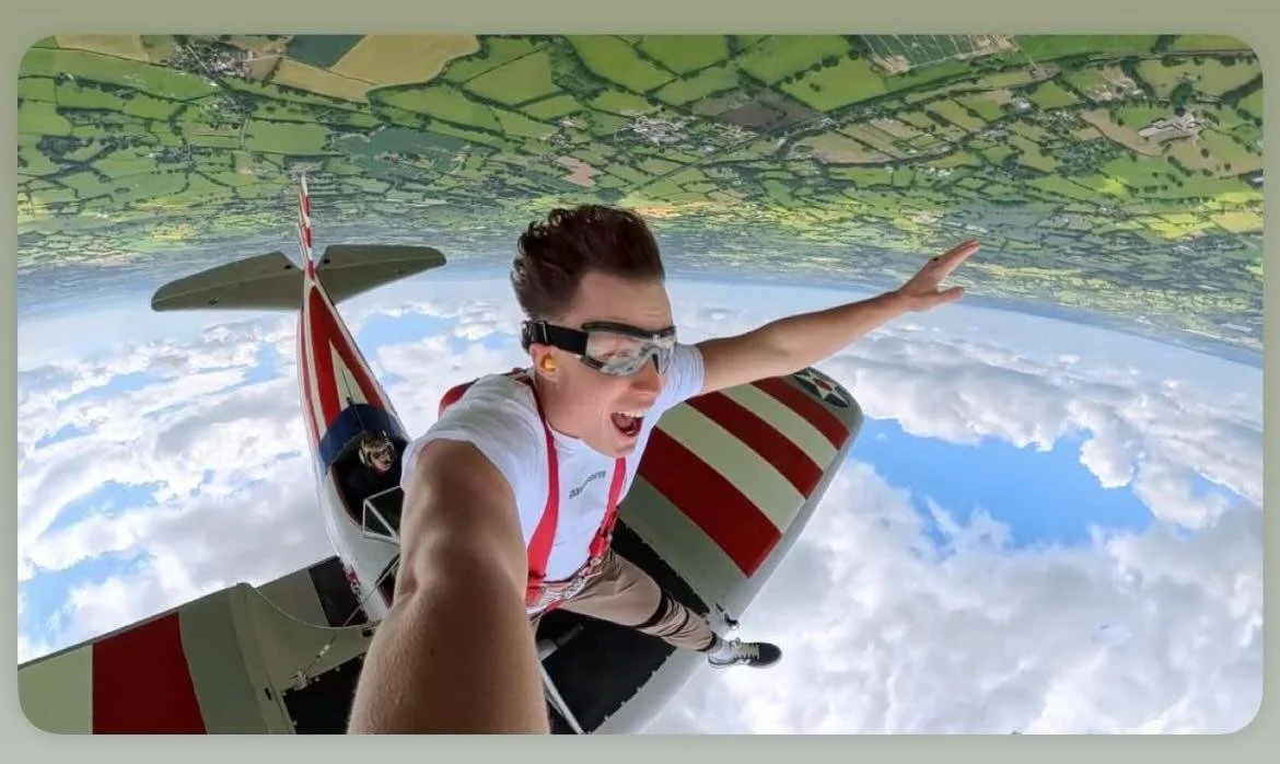 Able to climb unassisted up to the rig which is positioned on the wing of the aeroplane